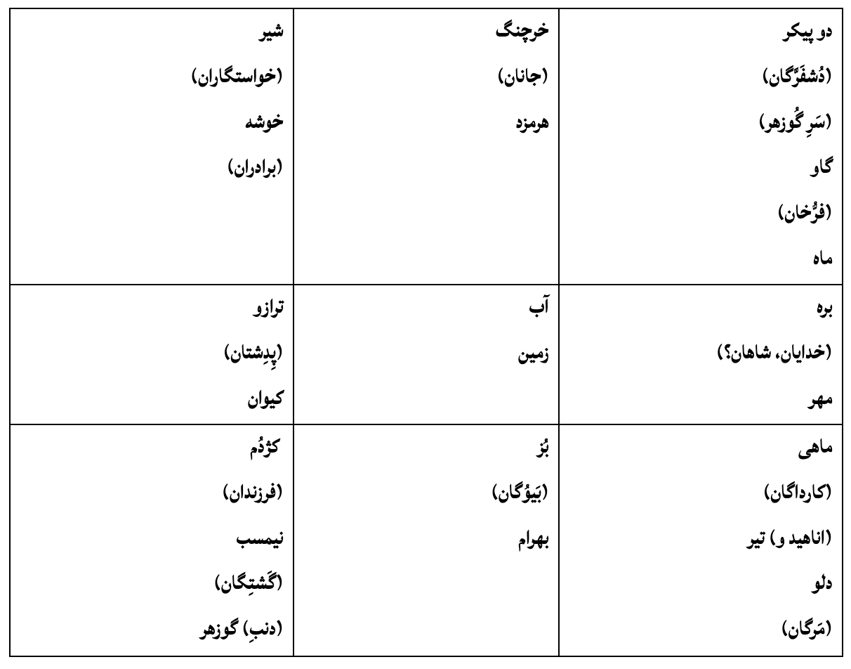 این سپهر به همانندی سالی نهاده شد: دوازده اختر چون دوازده ماه، هر اختری سی درجه است، چون هر ماهی سی شبانهروز. او هفتورنگ را به ناحیت شمال گمارد، آنجا که، چون اهریمن در تاخت، دوزخ شد. برای ادارۀ کشورها در (دوران) آمیختگی، از هفت کشور، از هر کشوری بندی بِدو پیوسته است و بدان روی است (که) هفتاورنگ خوانده میشود.