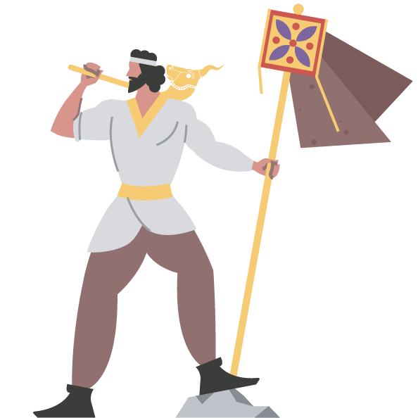 Kave, a blacksmith, rebelled when Zahhak took his son for sacrifice. Confronting the tyrant, he tore up a testimony declaring Zahhak’s righteousness and raised his apron as a flag. Rallying the people, Kaaveh led them to Fereydoon to overthrow the king. -