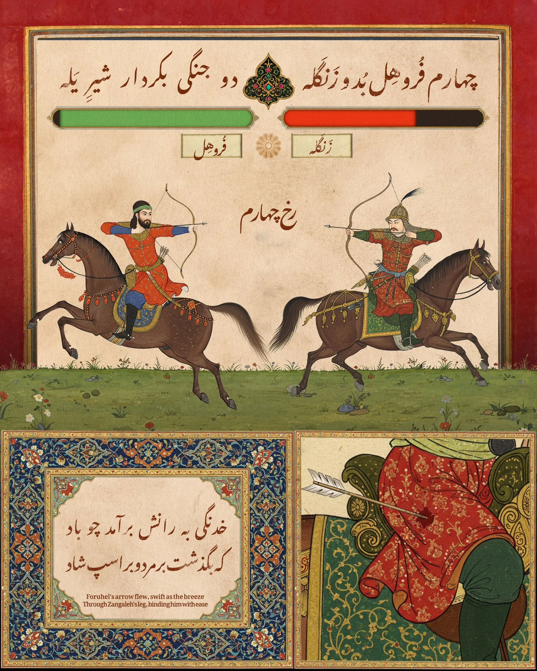 نبرد میان فروهل از ایران، و زنگله از توران. نتیجه> تیر در ران زنگله