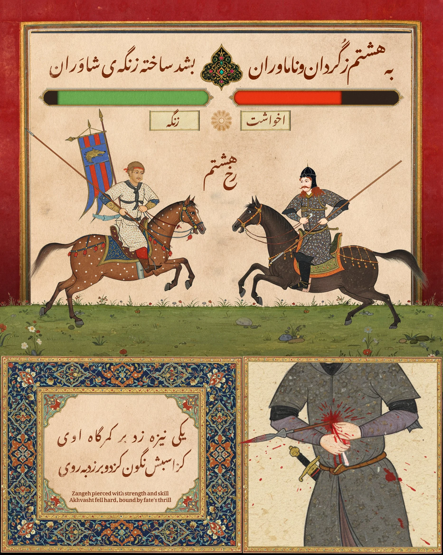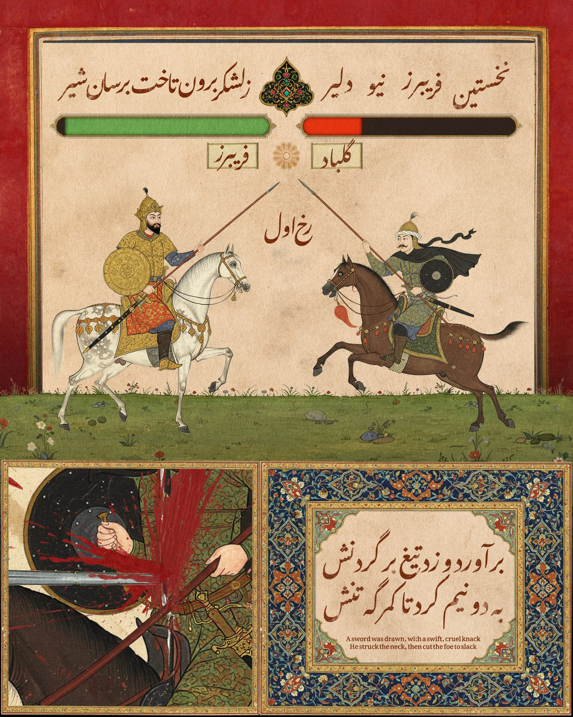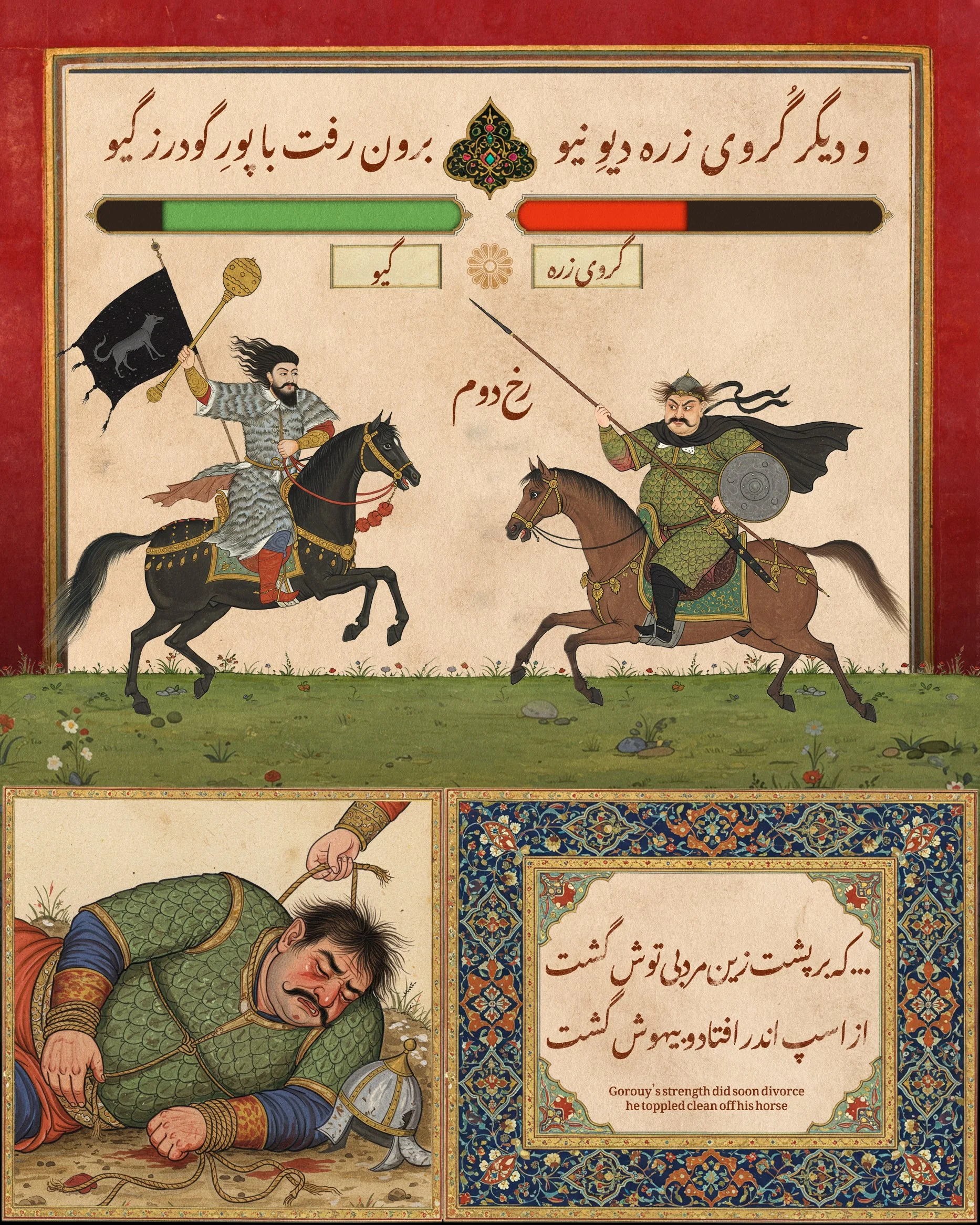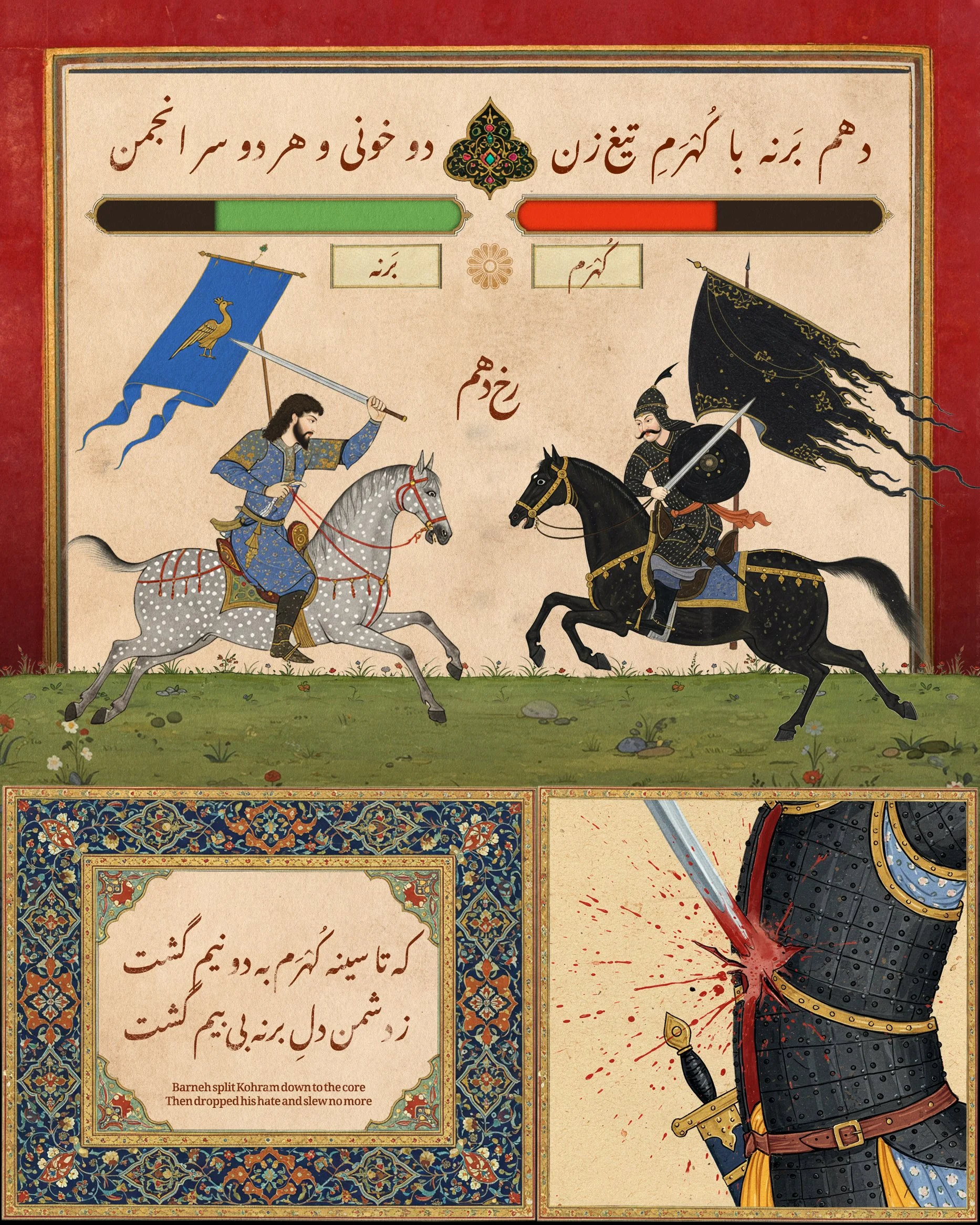 نبرد میان فریبرز از ایران، و گلباد از توران. نتیجه> نیم شدن گلباد