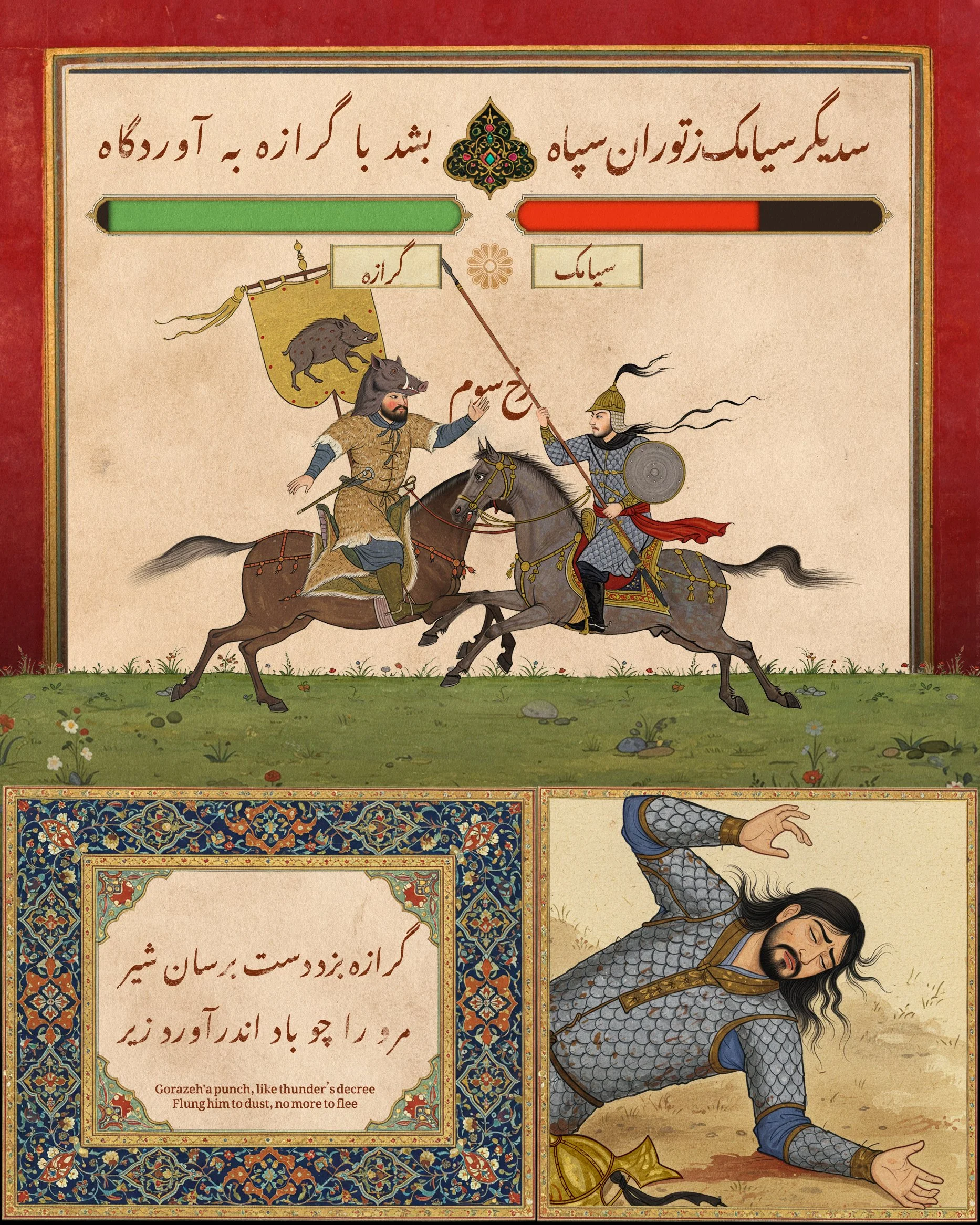نبرد میان گرازه از ایران، و سیامک از توران. نتیجه> از اسب افتادن سیامک