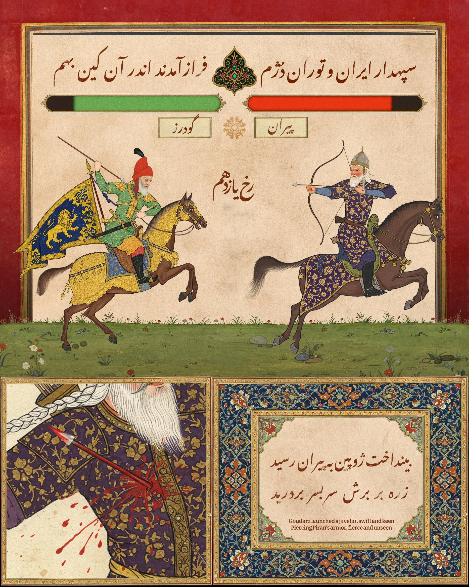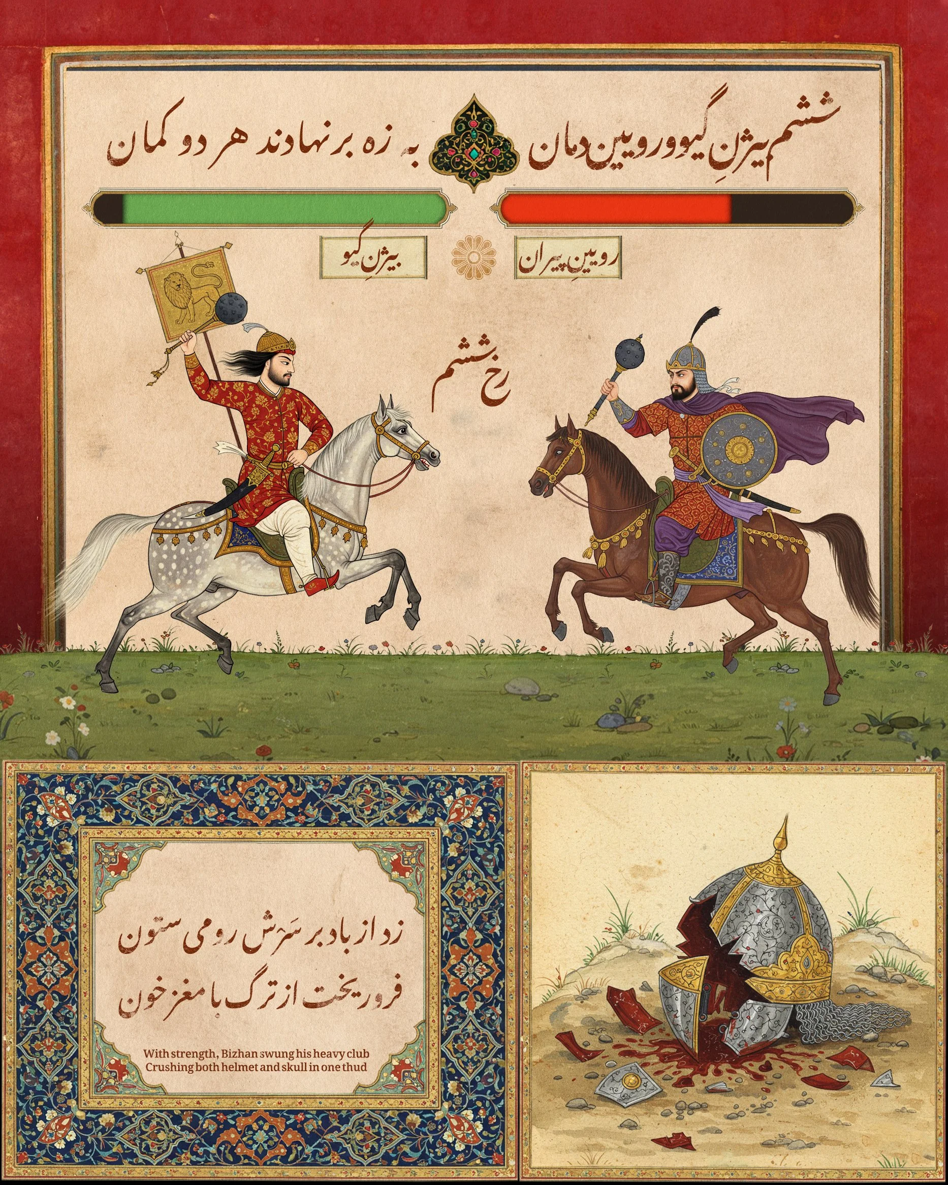 نبرد میان بیژن گیو از ایران، و رویین پیران از توران. نتیجه> گرز بر سر رویین