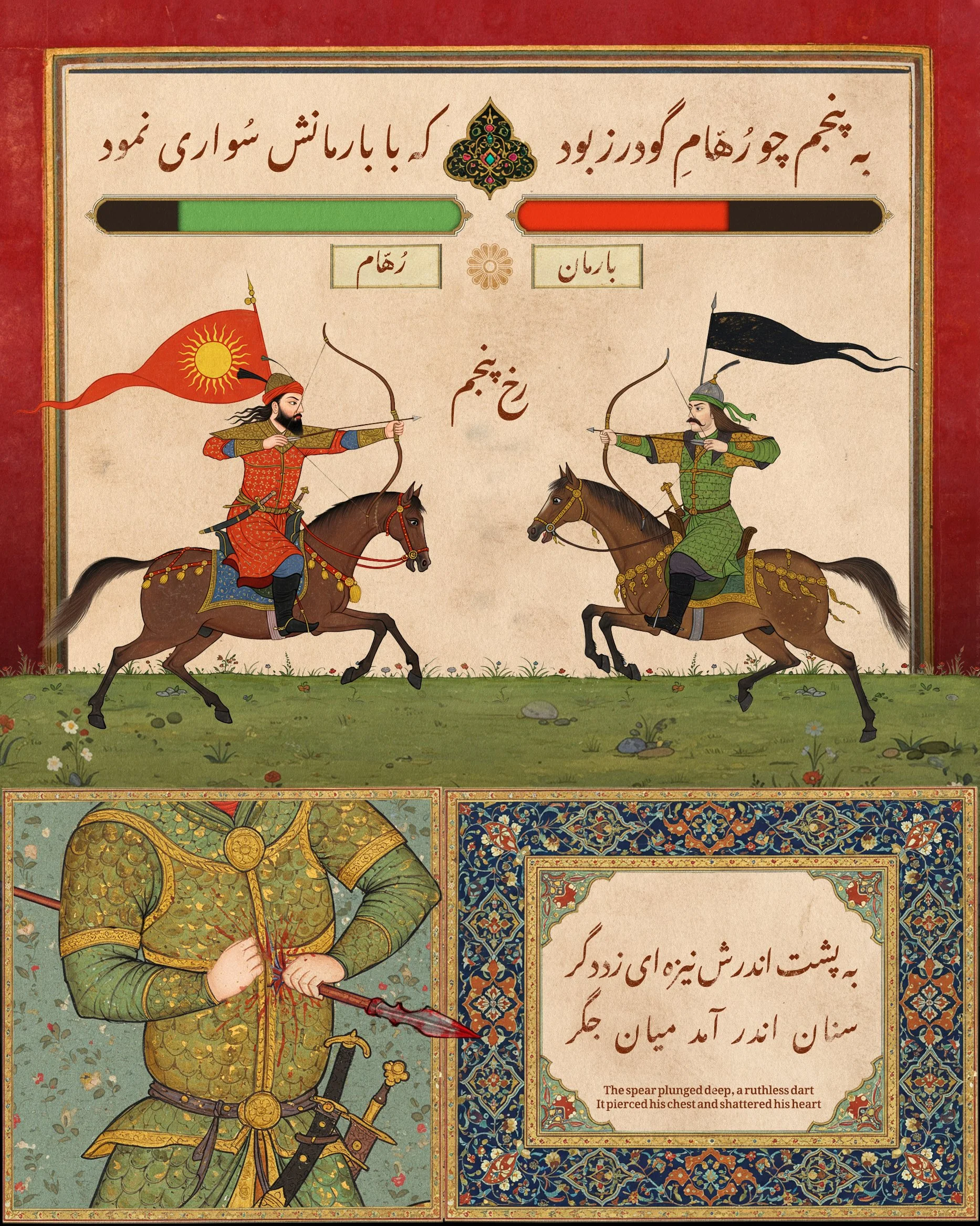 نبرد میان رهام از ایران، و بارمان از توران. نتیجه>نیزه بر جگر بارمان
